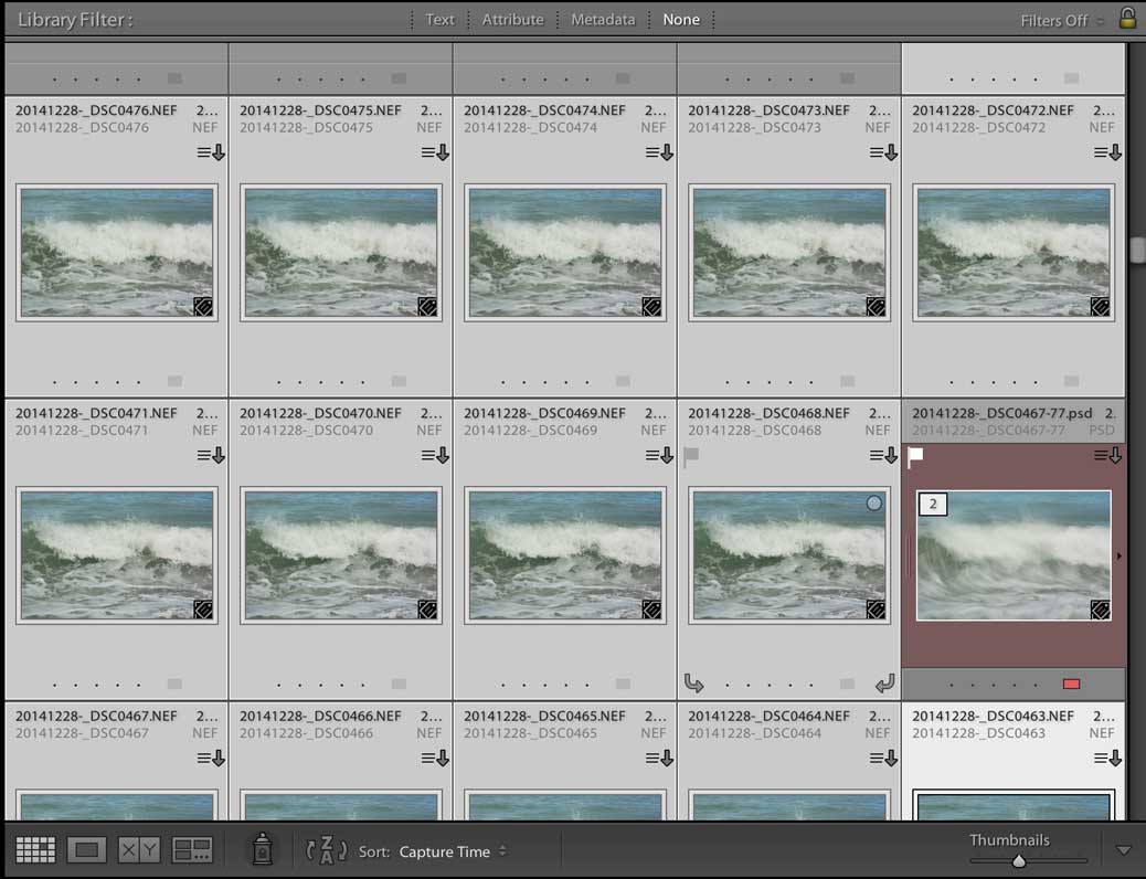 •  The images for this photo impressionistic wave were shot at 60 fps using Nikon’s N1 V3. I shoot hand held being careful to maintain a constant point on the subject even though the camera is panning. The images are then imported into Lightroom.